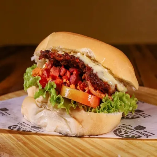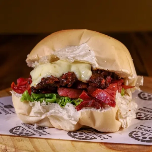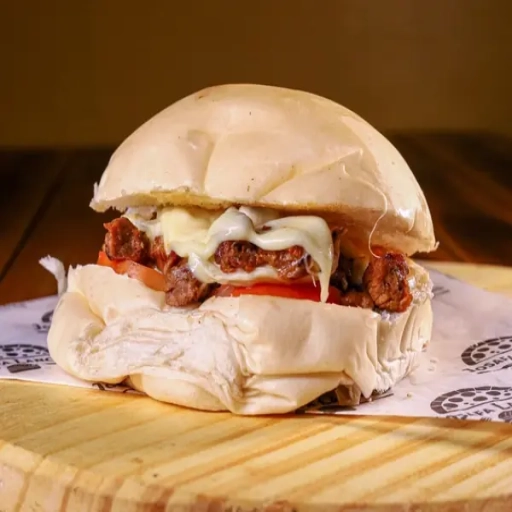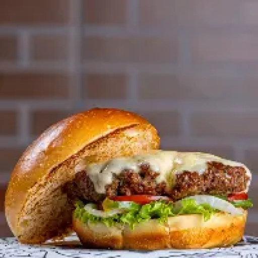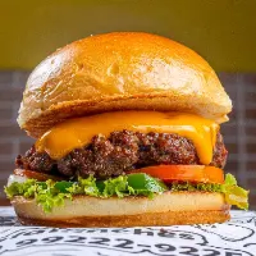 Pão brioche, fatia de queijo cheddar, super carne 130g, alface, tomate, cebola e pimentão.