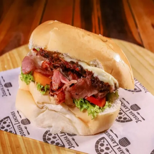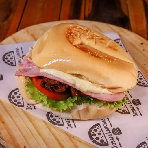 Pão bola, carne, presunto, queijo, alface e tomate.