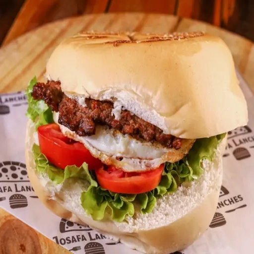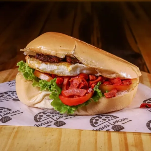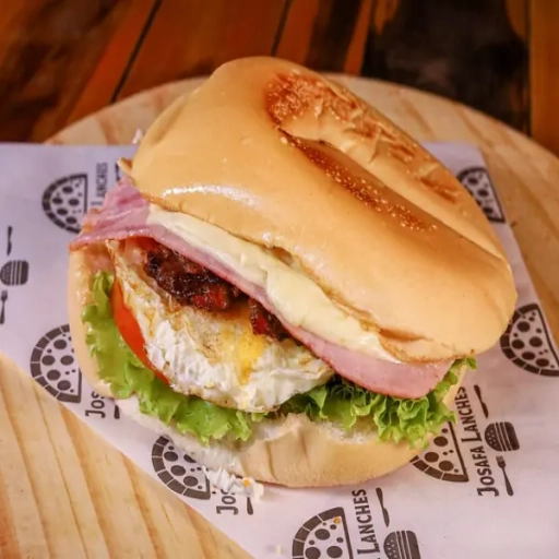 Pão bola, carne, ovo, presunto, queijo, alface e tomate.