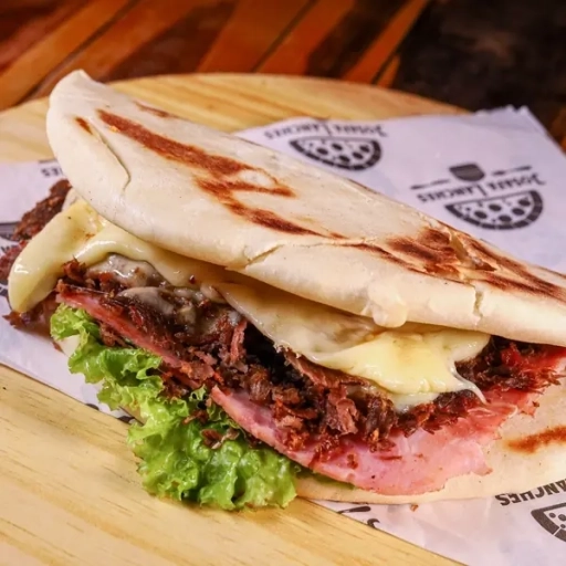 Pão bola, carne, calabresa, queijo, alface e tomate.