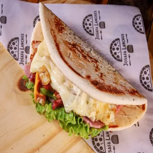 Pão bola, carne, frango, bacon, calabresa, queijo, ovo, salsicha, presunto, milho, alface e tomate.