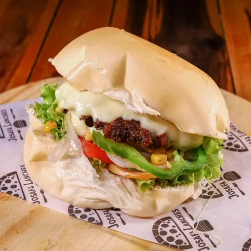 Pão bola, carne, queijo, milho, pimentão, cebola, alface e tomate.