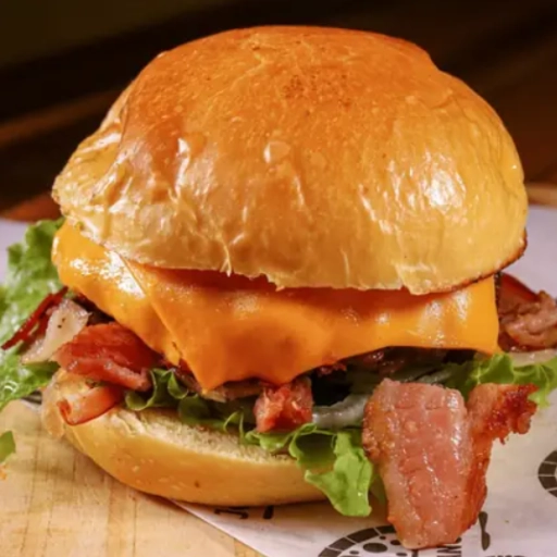 Pão brioche, queijo cheddar, bacon, super carne 130g, alface, tomate, cebola e pimentão.