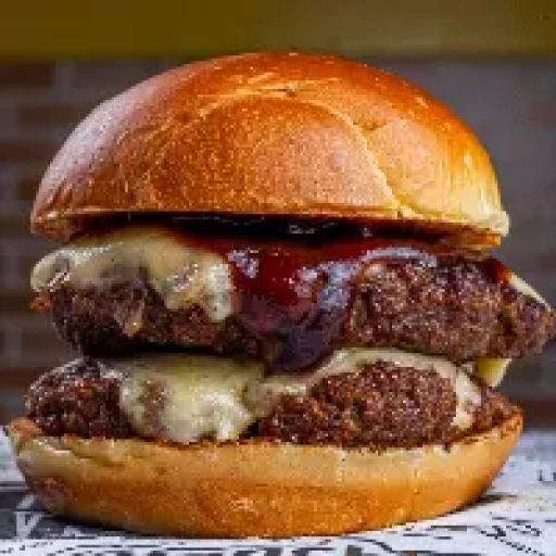 Pão brioche, 2 carnes de 130g, 2 queijos, molho barbecue e batata frita 125g.